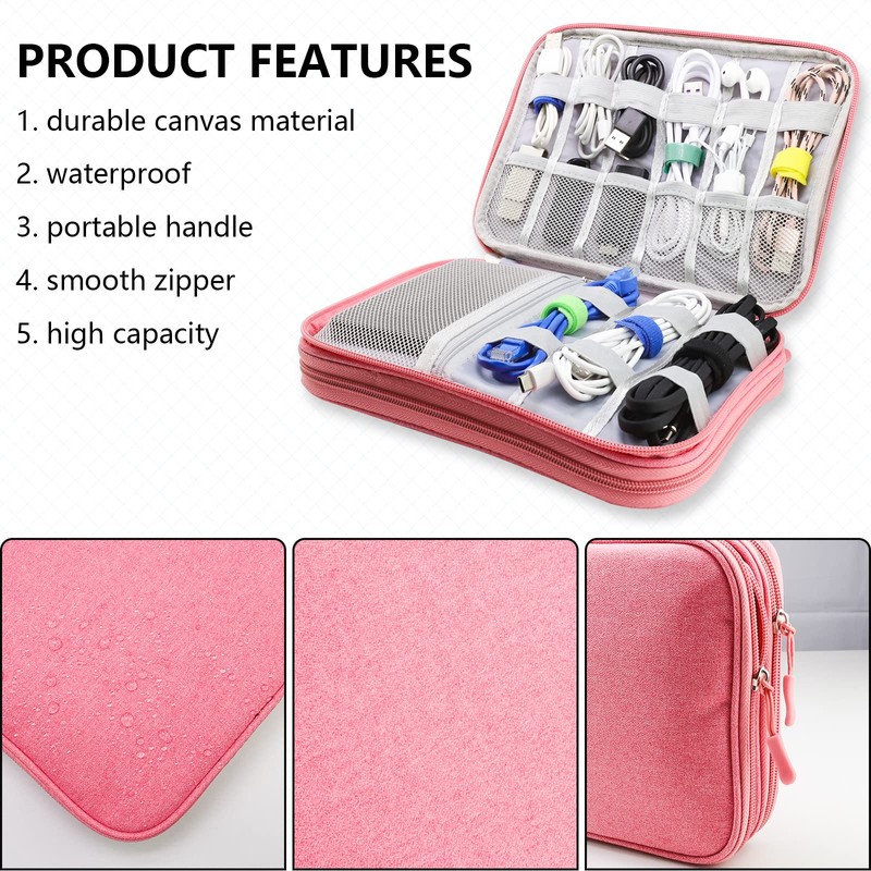 Teskyer Electronics Accessories Organiser Bag, Waterproof Cable Organiser Bag, Travel Gadget Bag, Holiday Essentials for Women, 9.6 x 6.9 Inch, Pink