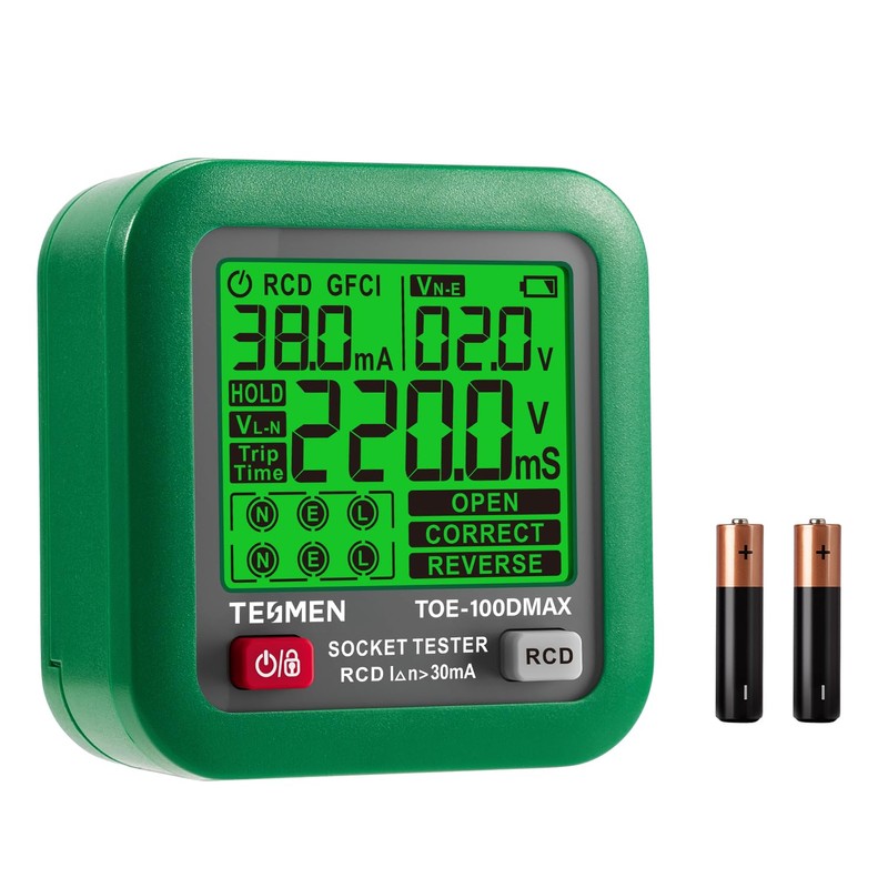TESMEN TOE-100EMAX Intelligent Socket Tester with GFCI/RCD Trigger Test, LCD Display, Voltage/Current Detection - For Home Inspections and Daily Safety Testing - Green
