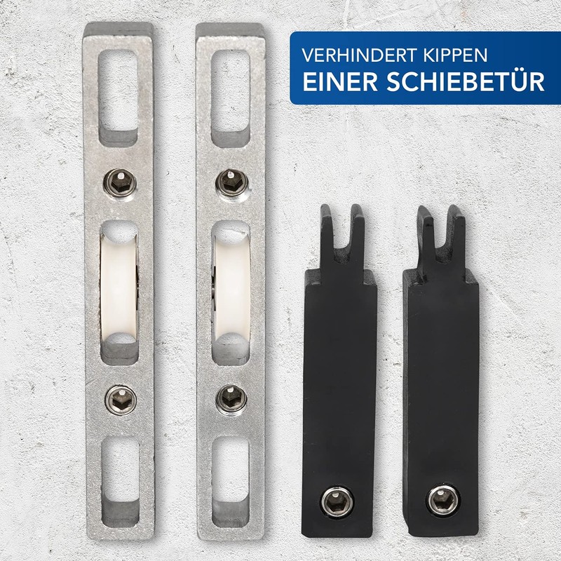 - Assembly and use: the assembly and application of the wheels is very easy. Thanks to the rails, the sliding door does not tilt unexpectedly. The delivery includes 2 roller runners, 2 guide wedges and a description/instruction manual (English language not guaranteed).