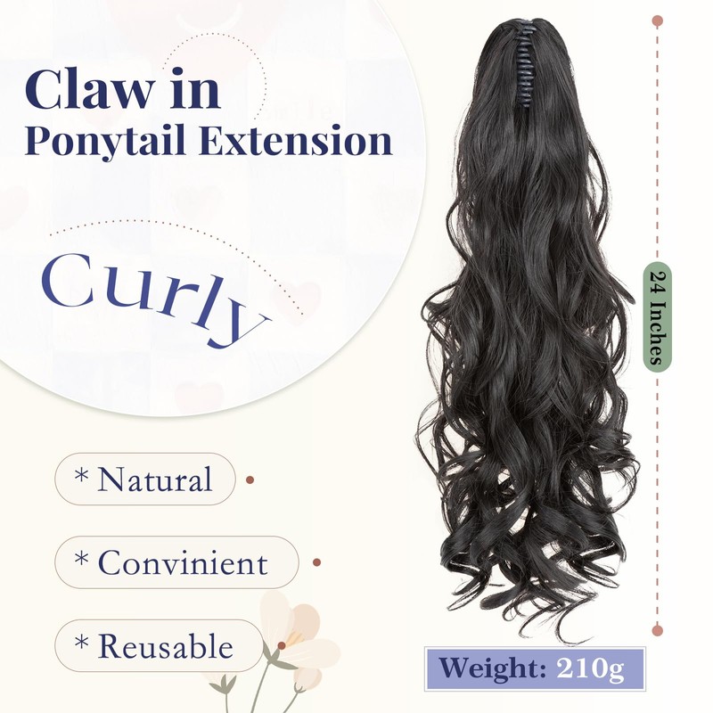 TESS 24'' Curly Ponytail Extensions, 210g Claw in Long Ponytail, Hair Pieces for Women, Black