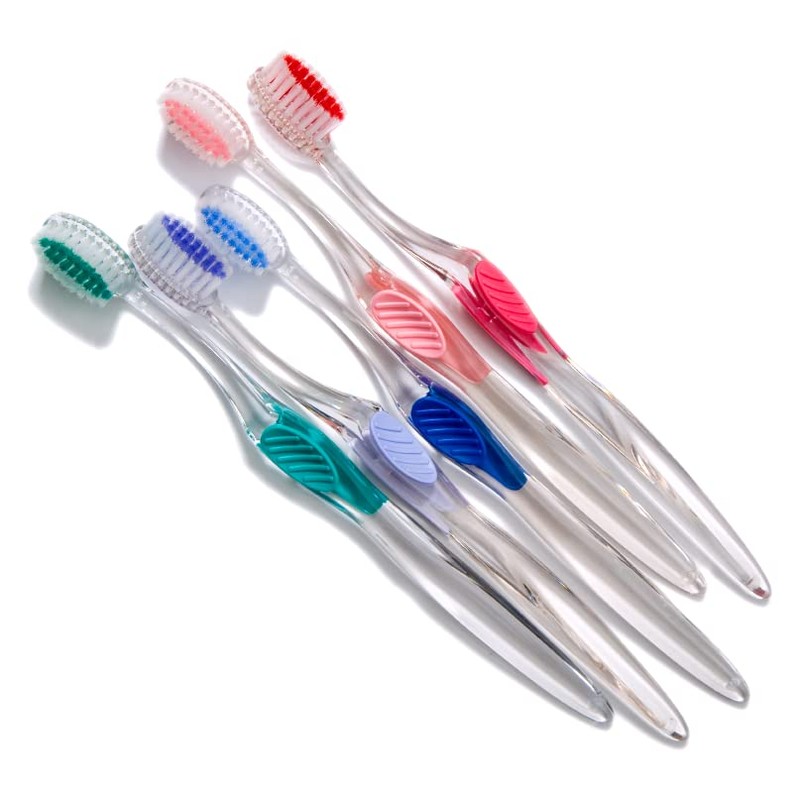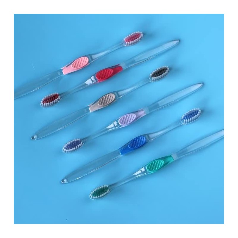 This toothbrush has a compact, oval shape head for small mouths. Its extra soft and soft bristles provide gentle, but effective cleaning on sensitive teeth and gums. The clear handle has a rubber thumb grip for control while brushing. Comes in six assorted handle colors including teal, pink, lavender, raspberry, blue and silver. You will receive 72 assorted color toothbrushes. Each toothbrush arrives individually wrapped in recyclable, clear cello-wrap. Made in the USA.