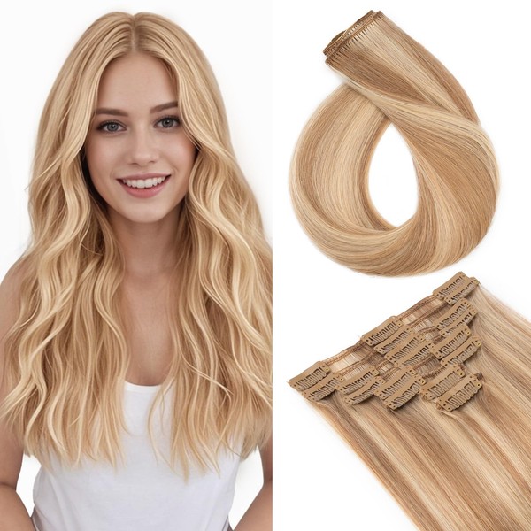 TESS Seamless Clip in Hair Extensions Human Hair Remy Clip ins Natural Soft Straight 8pcs 18Clips, 12 Inch, Flax Yellow Mixed Light Gold