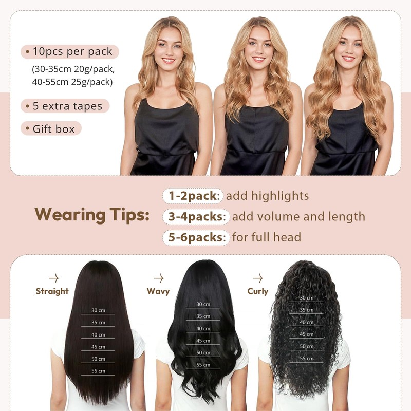 • Advanced double stitching adhesive technology: our tape extensions glue use innovatively reinforced double seams that ensure a particularly secure and durable attachment. The cuttable adhesive strips allow precise adjustment and guarantee a firm hold.