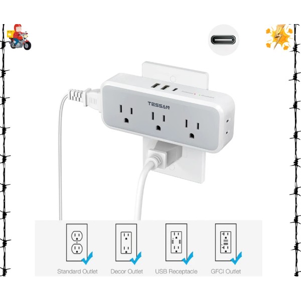 TESSAN Multi Plug Outlet Extender with 5 Outlets and 3 USB Ports for Home or Office