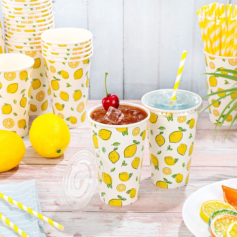 Tessco for you Tessco 150 Pieces/50 Sets Lemonade Cups with Lids and Paper Straws 16oz Disposable Iced Coffee Paper Cup Summer Citrus Cold Lemonade Stand Supplies for Fruit Party Beverages Drinks Juices