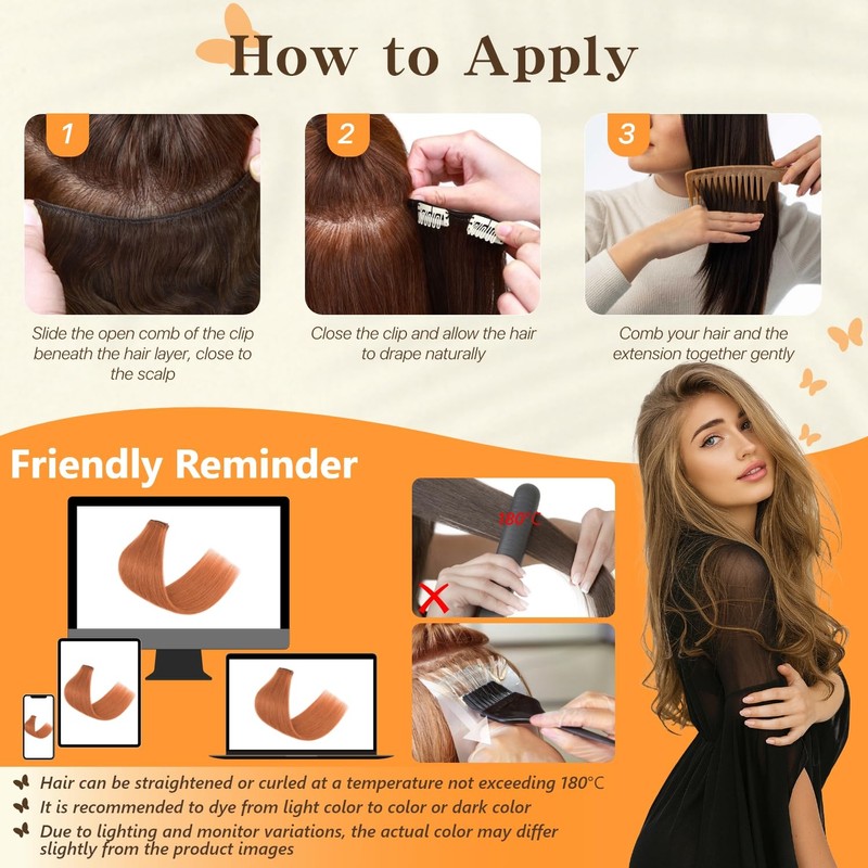 - 【Suitable Occasion】tesshair 100% Remy Human Hair Extensions – Tangle-Free, Ultra-Soft & Silky, with No Shedding & Natural Straight Texture.✔ Versatile Styling – Can be washed, trimmed, curled, or straightened (heat-safe up to 356°F).✔Dye-Friendly – Can be colored from light to dark shades (avoid bleach on dark extensions).✔Seamless & Stylish – Clip-in design blends naturally for a comfortable, flawless look—perfect for weddings, parties, concerts, theme events, shopping, or everyday wear