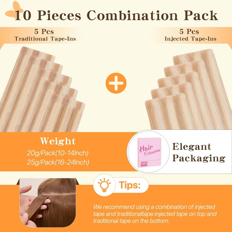 - 【Tape Hair Extensions Specifications】Our package includes 10 tape in hair extensions (5 injected tape in extensions and 5 traditional tape in extensions), with a total weight of 20g (2g per piece).