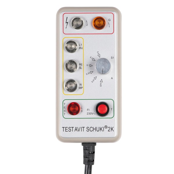 • Box contents: Testavit Schuki 2K socket tester with FI test with adjustable rated residual current - ABS plastic housing - Power supply via test device - Colour: grey.