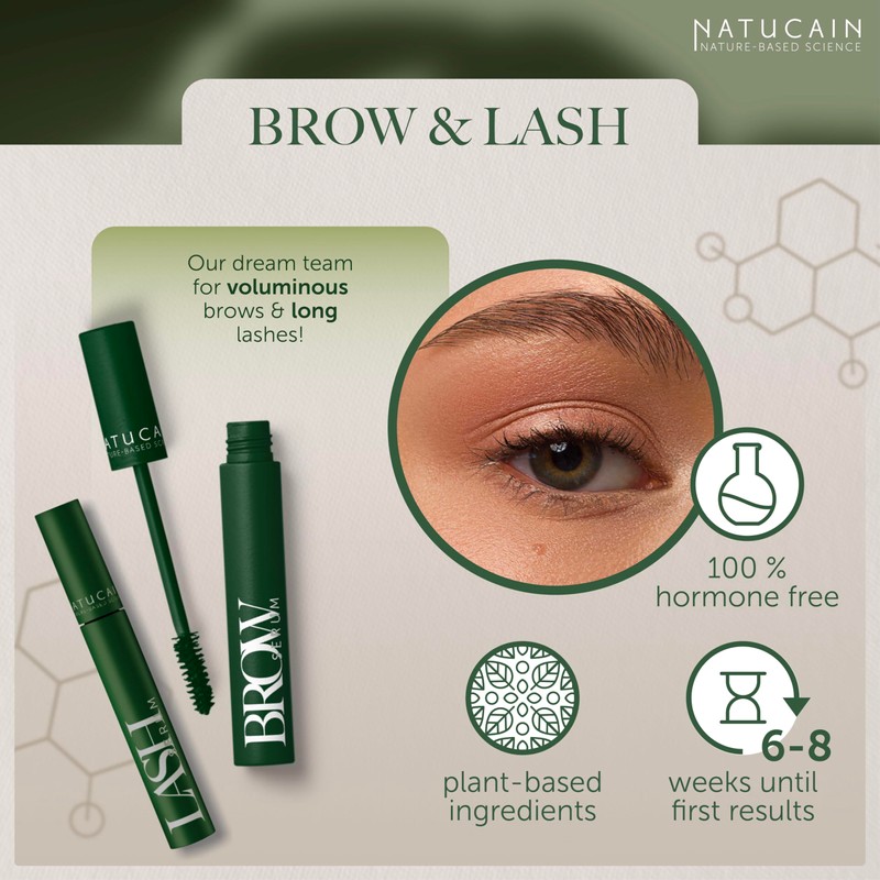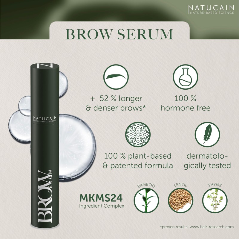Natucain: The eyebrow and eyelash serum. The latest innovations from Natucaine, the eyebrow serum and the eyelash serum, conjure up longer eyelashes and thicker eyebrows with 100% ingredients of natural origin. Thanks to the innovative patented hair growth formula with MKMS24, the hair growth of brows and eyelashes is stimulated directly at the hair root. And without hormones, but with the power of nature. Up to +52% longer eyelashes and up to +54% thicker eyebrows! Application: 1. Apply the eyebrow serum to the cleaned, dry and oil-free eyebrow area. 2. Brush off excess serum at the edge of the bottle before applying. 3. Allow the serum to absorb completely before proceeding with your usual cosmetic routine. For faster results after 6-8 weeks, it is recommended to use the serum twice daily (morning and evening). Then one application once a day is sufficient.