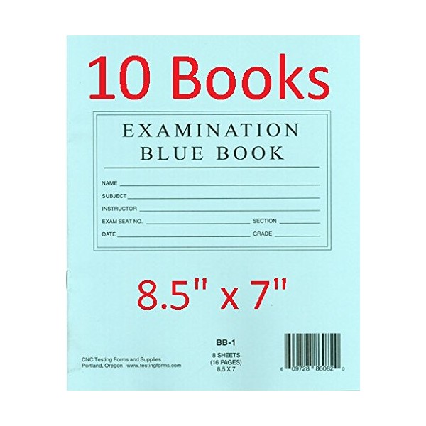 Blue Book 8.5"x7" 10 Pack – 8 Pages 16 Sheet. Examination Blue Book Book has a flexible blue stapled cover. Wide rule paper with margins.