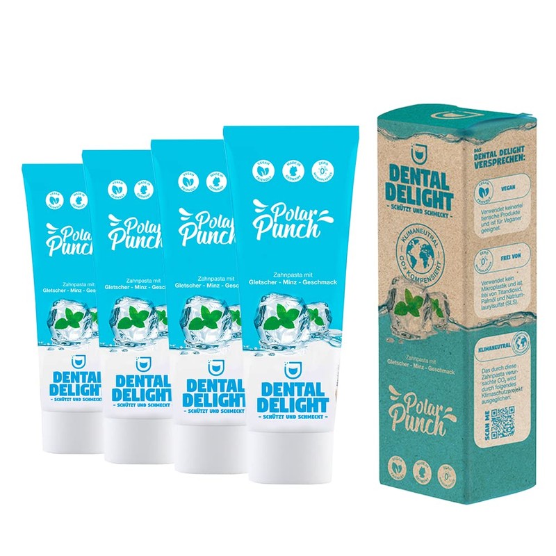 TESTSIEGER bei Stiftung Warentest (Note 1,2 SEHR GUT): DENTAL DELIGHT Polar Punch 4er-Pack Zahncreme Gletscher-Minze Vegan Klimaneutral Mikroplastik-frei