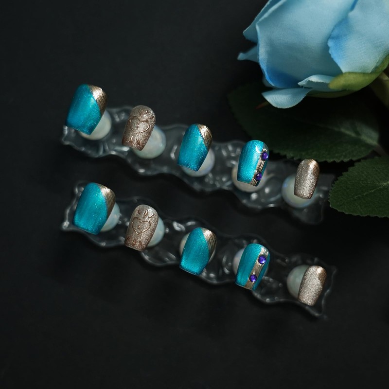 - Salon-Perfect Gel Hand-Painted 3D Designs: Achieve luxury salon nails in 5 minutes with these Tesytto hand-painted short square press-ons. Features gel-polished gold heart line glitter & cat eye with blue rhinestone design - not ink prints - for vibrant, non-fading nail art. Save time and money