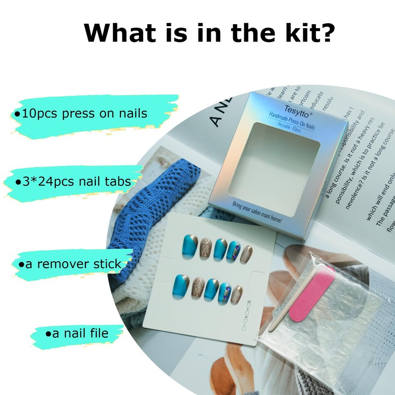 - Packaging Content: 10pcs handmade acrylic press-on nails (Size S), 3*24pcs jelly adhesive tabs, nail file, nail stick
