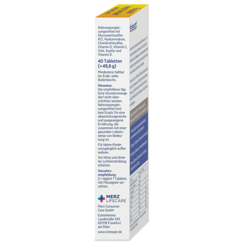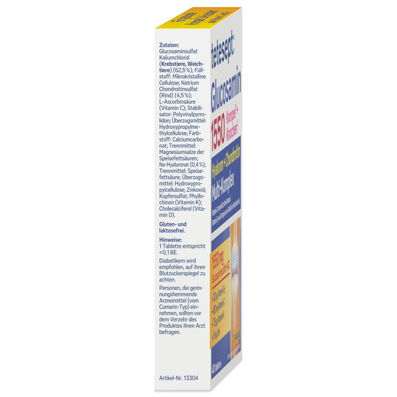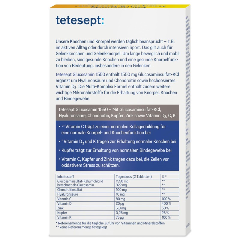 - Box contents: 1 x 40 tablets tetesept glucosamine 1550 - nutrients for cartilage, bones, connective tissue and muscles - with glucosamine sulphate KCl, hyaluronic acid, chondroitin, high dose vitamin C & D3, vitamin K, zinc & copper