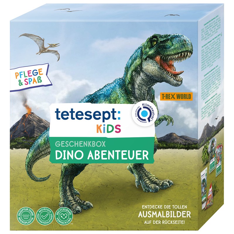 - Box contents: 1 x children's bath accessory gift set dinosaur adventure with 8x tetesept Kids bath additives and 1x tetesept Kids shower - colourful children's bath fun and colouring pictures on the back of the gift box