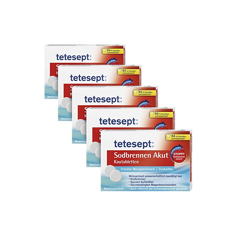 • Lieferumfang: tetesept Sodbrennen Akut Tabletten (5 x 20 Stück) ohne Zucker, Magenschmerzen Tabletten zur Bindung überschüssiger Magensäure, bis zu 8 Tabletten täglich einnehmbar.