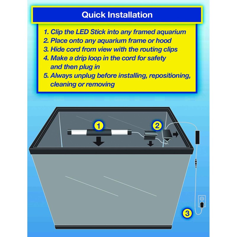 The Tetra Hidden LED Stick provides brilliant white aquarium light for aquariums up to 15 gallons This compact waterproof light fixture clips quickly and easily onto any framed aquarium – place on the frame or under the hood The cord can also be hidden from view by using the included routing clips You will love the natural underwater shimmer effect When installing make a drip loop in the cord for safety before plugging in Always unplug before installing repositioning cleaning or removing This fixture measures 6 inches long Small aquariums are a great way to get started in the freshwater fishkeeping hobby and with any new hobby involving living creatures it is always best to learn as much as you can When buying fish ask your retailer for guidance in choosing the right fish for your size aquarium Since 1951 Tetra has developed the world’s most comprehensive body of fish food knowledge and fishkeeping enthusiasts have looked to the brand for products and solutions that add ease and beauty to their home Whether you're an experienced hobbyist or just starting out Tetra has everything you need – from a large variety of quality fish food and innovative equipment to test kits and decor