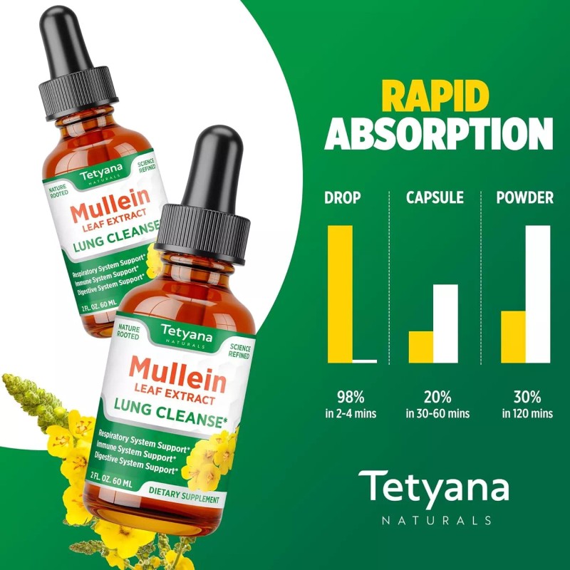 - The Reason for Tetyana Mullein Drops: Tetyana Mullein Drops offer unparalleled convenience compared to capsules, absorbing rapidly with an impressive 98% absorption rate within 2-4 minutes. Derived from a natural formula featuring the traditional herb mullein, renowned for its lung-cleansing properties, it provides an effective and efficient solution for respiratory wellness.