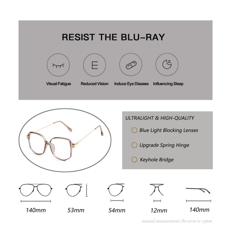 • PRODUCT SIZE - Lens width: 54mm, Frame height: 53mm, Nose bridge: 12mm, Frame width: 140mm, Temple length: 140mm, net weight: 17.5g.