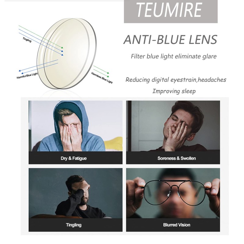 Teumire anti-blue light glasses mainly reflect harmful blue light through the lens surface coating or add anti-blue light factor through the lens base material to absorb harmful blue light, thereby achieving the blocking of harmful blue light and protecting the eyes.