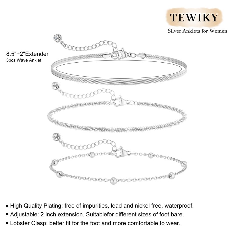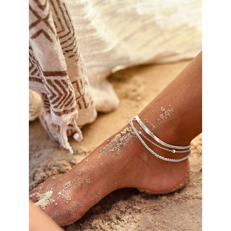 Tewiky Sterling Silver Anklets for Women,Dainty Triple Layered Waterproof Ankle Bracelets for Women Adjustable Sparkly Herringbone Beaded Rope Chain Set Stackable Cute Summer Beach Jewelry Gifts
