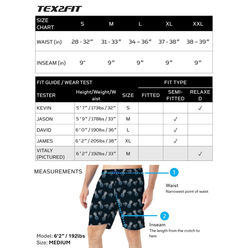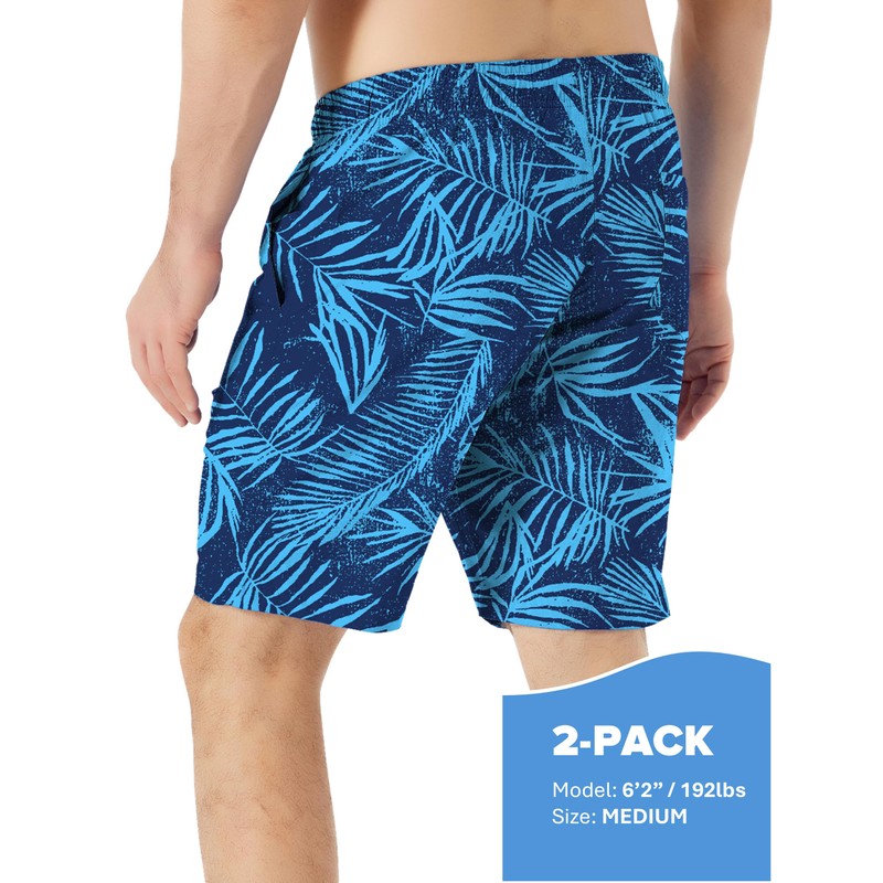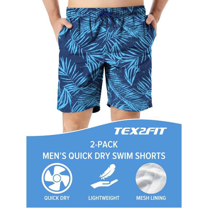 TEX2FIT 2-Pack Men's Swim Shorts with Pockets, Quick Dry Swim Trunks with Mesh Lining (Blue Leaves/Pineapples, X-Large)