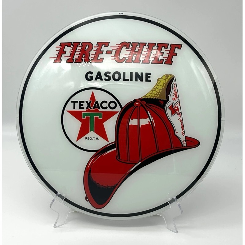 A premium 13.5" TEXACO FIRE CHIEF glass face for a gas pump globe. This quality heavy gauge glass face is MADE IN THE USA.