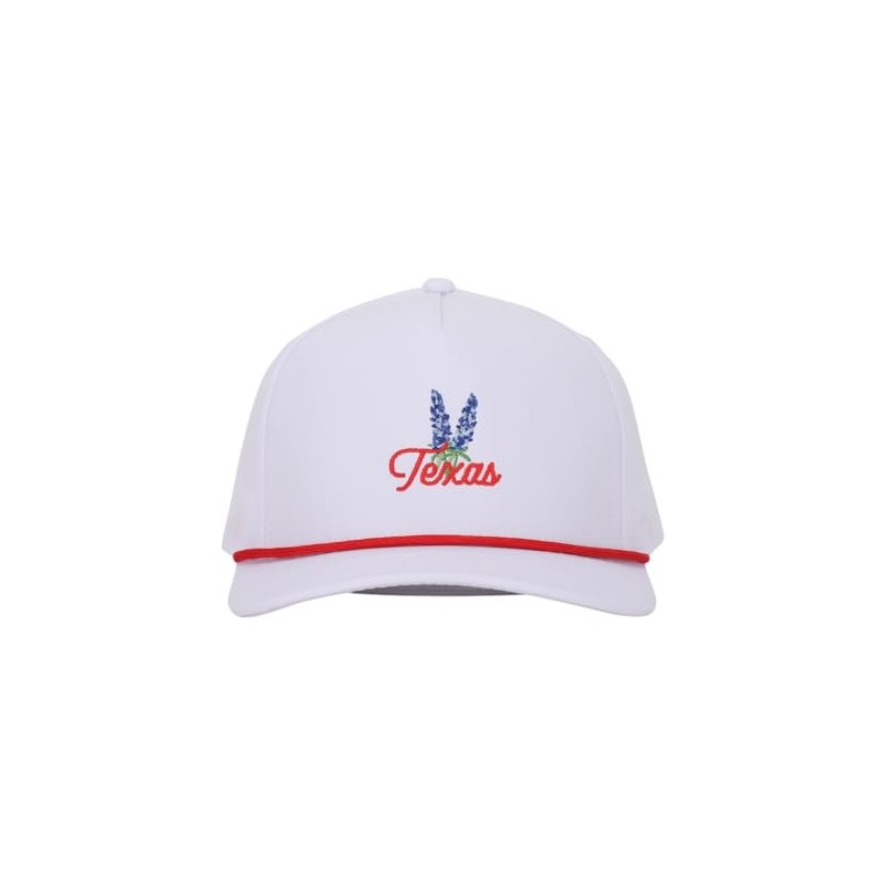 The word "Texas" is prominently displayed on the front of the hat, with each letter rendered in an elegant maroon script. The maroon color, which is often associated with the state of Texas and its various sports teams, adds a touch of Texas pride to the hat. The bluebonnet on the hat is typically depicted in a vibrant shade of blue, with intricate detailing to capture the flower's unique characteristics. The golf rope hat combines comfort, style, and regional pride in a single piece of headwear, making it a popular choice for those who want to showcase their love for Texas while enjoying outdoor activities