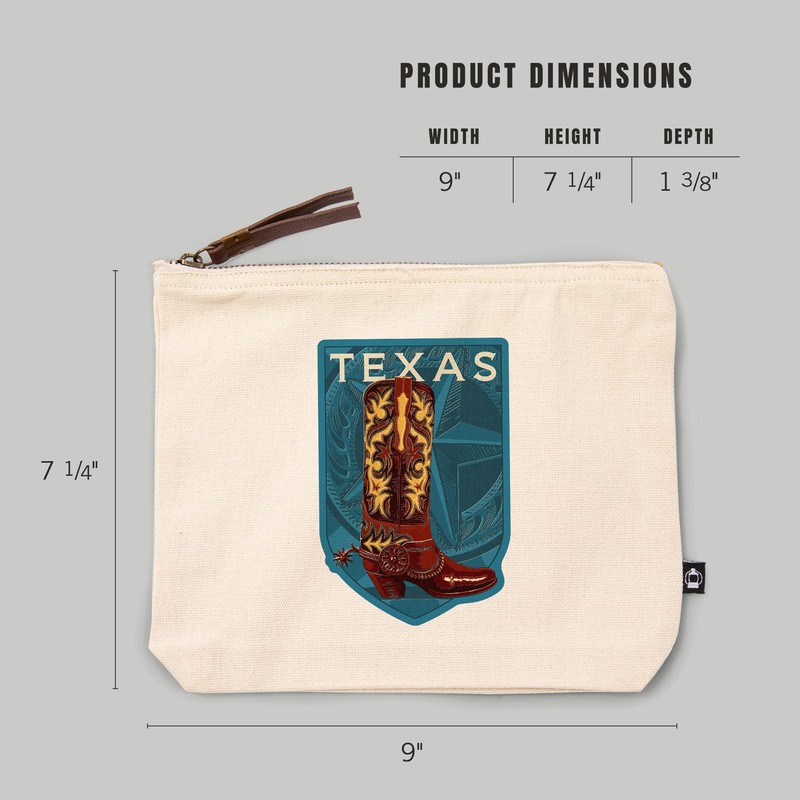 - Texas, Boot Letterpress, , 100% Cotton Zipper Pouch, Travel Accessory, Go Bag, Size of 7.25 x 9 inches.