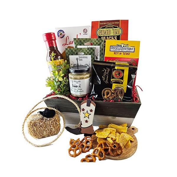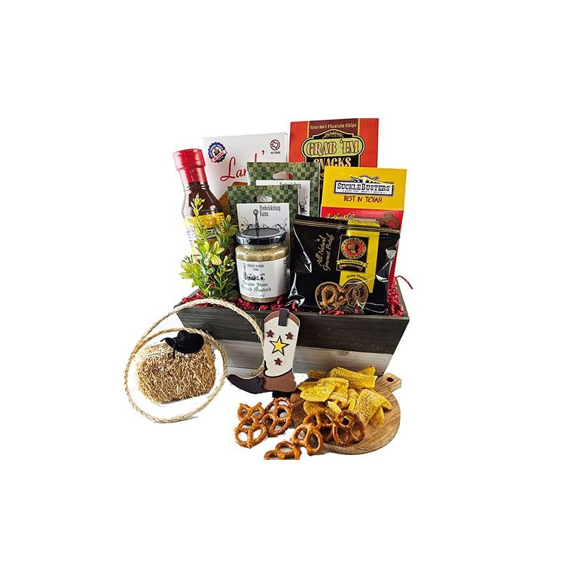 Yeehaw! Saddle up for the best Texas-themed gift basket you’ll ever come across – the "Texas Round Up." This unique basket captures the spirit of the Lone Star State with a handpicked selection of authentic Texas goodies and treats. From the finest local barbecue sauces and mustard, artisanal cowboy-inspired snacks, this basket is a true Texan delight. And guess what? It’s delivered right to your doorstep, making it the most convenient and heartfelt way to share a taste of Texas with your loved ones near and far. So wrangle up some Texas charm and let the "Texas Round Up" gift basket rope in your heart!