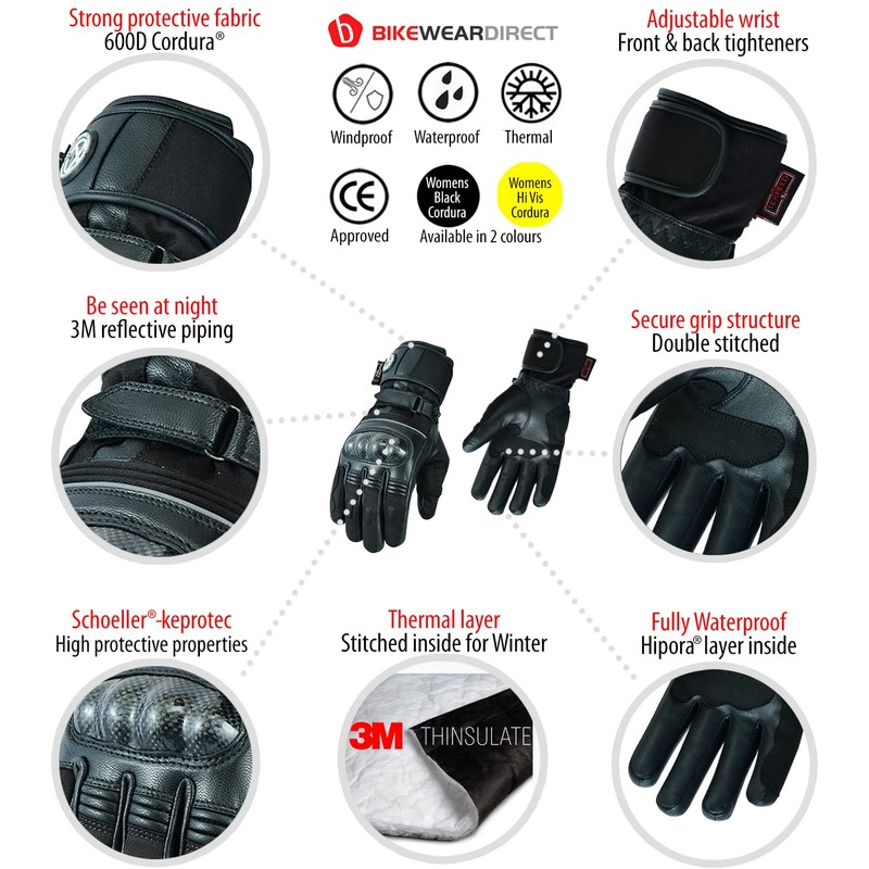Texpeed Womens Motorcycle Waterproof Leather Gloves - Ladies Cordura Textile Motorbike Moped Scooter Gloves With Biker CE Knuckle Armour Protection Black - (L)