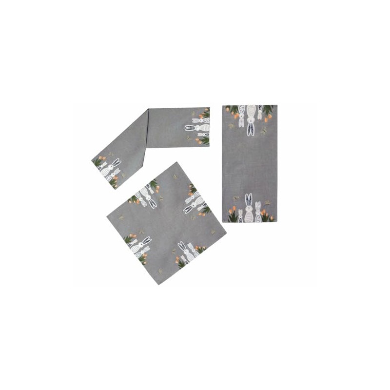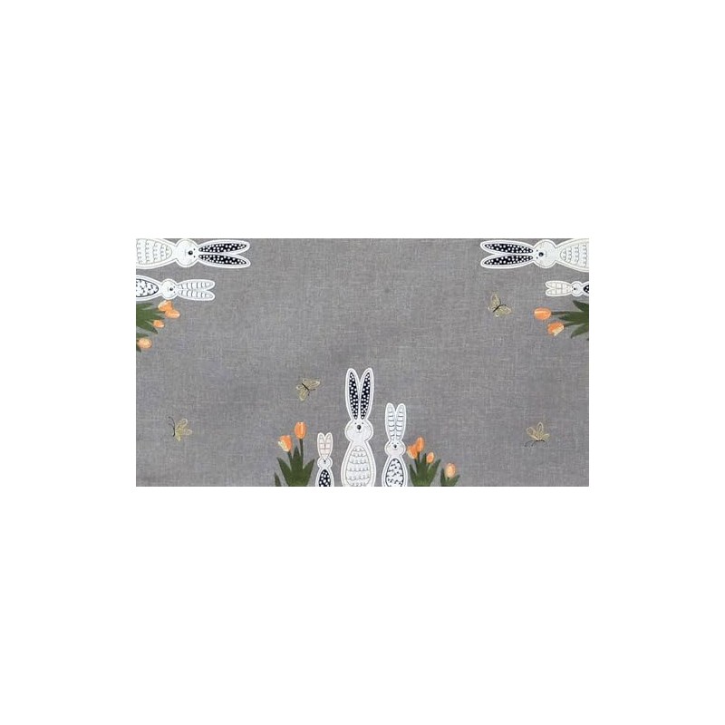 - Cute tablecloth with loving embroidery modern Easter bunnies on a grey background