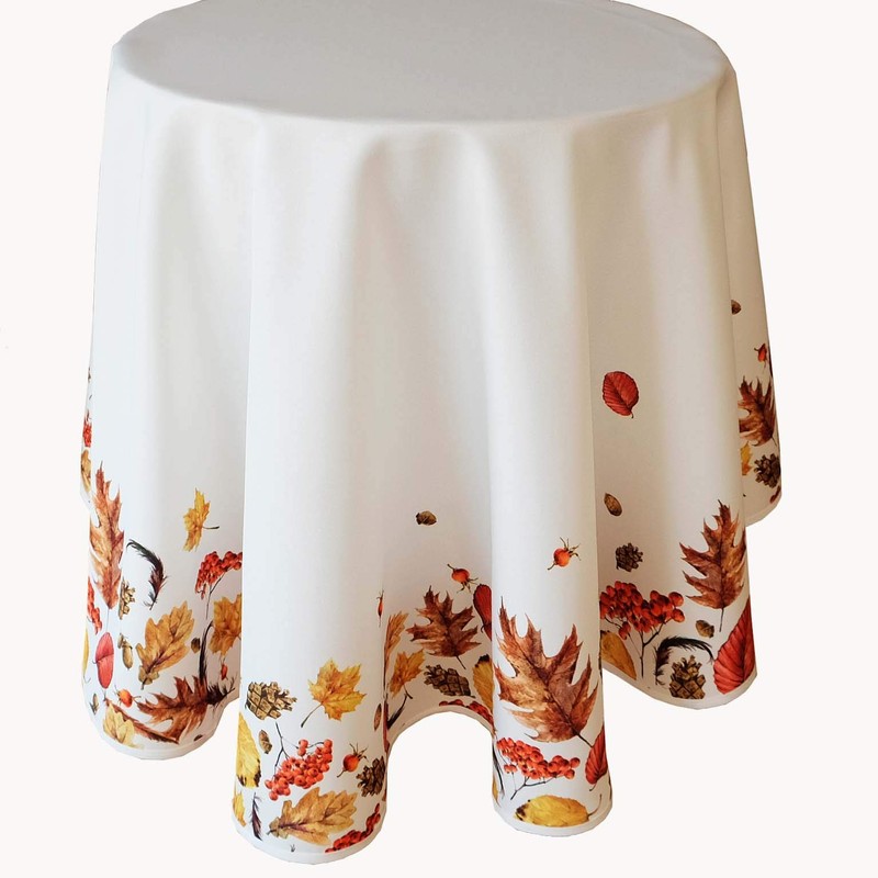- Easy-care, with autumn motifs in a subtly textured matte look and fine quality. The tablecloth is printed with leaves and is a real eye-catcher.