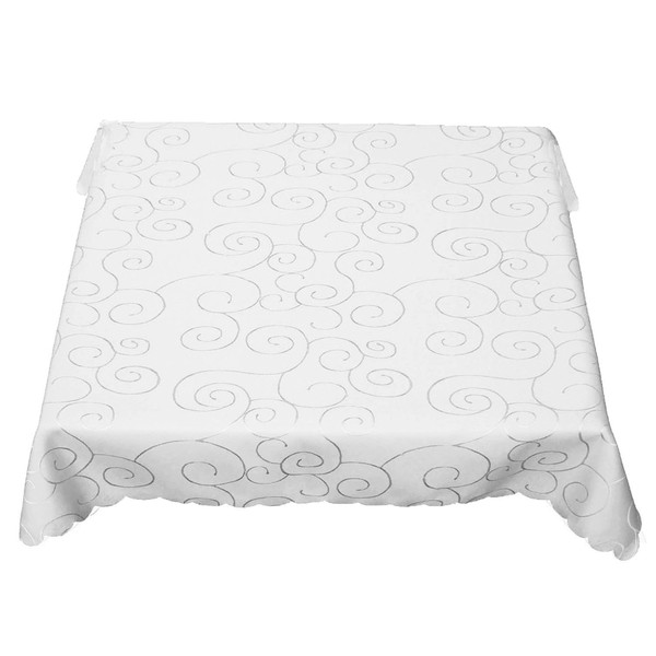texpot Tablecloth 130 x 220 cm Oval White Wipe Clean Tendrils Scroll and Bow Edge Non-Iron