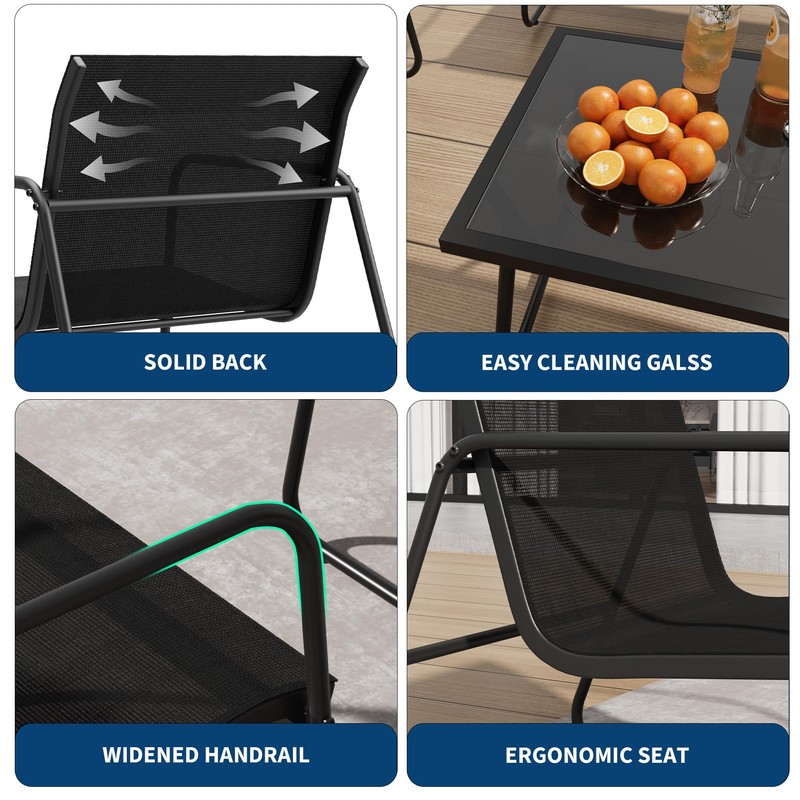 - Tempered Glass Table: The table is equipped with new tempered glass that can withstand impacts and heat. It can hold decorative items such as small flower pots, or serve as a surface for your phone, fruit platter, or wine glass while you read or chat with friends. The embedded design keeps the tempered glass top secure, and the built in screw set adds an elegant flair to any outdoor living space, balancing safety and style