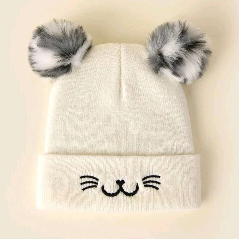 Textiles 4 Home Women’s Girls Knitted Winter Beanie Hat with Two Pom Poms and Embroidered Cat Whiskers (White)