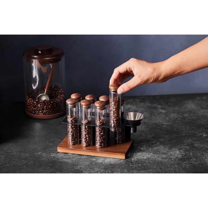 Teyearlife Coffee Bean Cellar Tubes Single Dose Set of 8 Borosilicate Glass Sealing Tubes for Espresso Enthusiasts and Family Baristas One-Way Exhaust Valve Walnut Stopper for Smoother Pouring