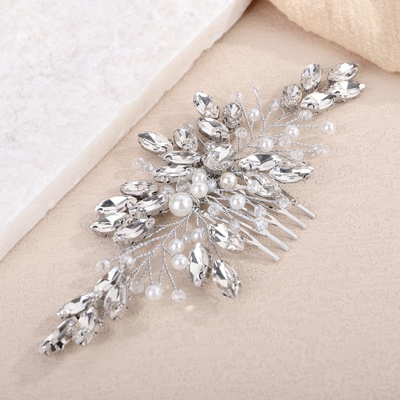 Teyglen Bride Crystal Wedding Hair Comb Bridal Headpiece Handmade Silver Rhinestone Hair Comb Piece with Pearl Hair Accessories for Women (Silver)