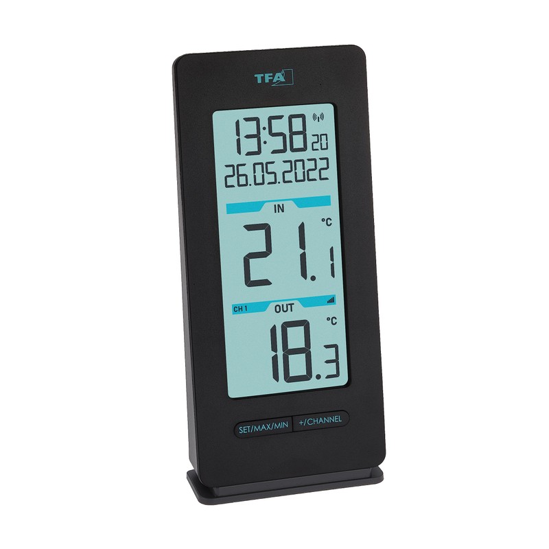 TFA Dostmann Buddy 30.3072.01 Radio-Controlled Thermometer Outdoor Temperature and Indoor Temperature Maximum and Minimum Values Radio-Controlled Clock Black