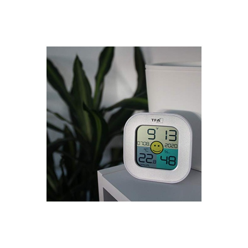 - Comfort zone indicator: yellow smiley in the middle, indicates whether the values are ideal, too dry or too damp, so you can detect a risk of mould in time