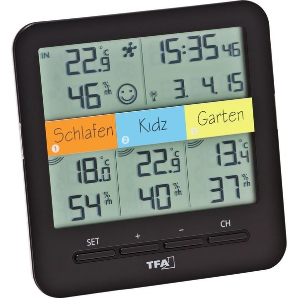 - 3 x transmitters: included with wireless transmission of outdoor temperature and humidity; individual labelling of the locations possible