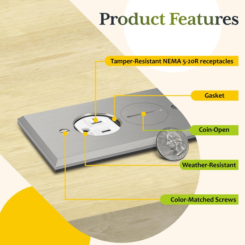 - Screw covers protect outlets from dirt buildup and eliminates tampering by children and animals.