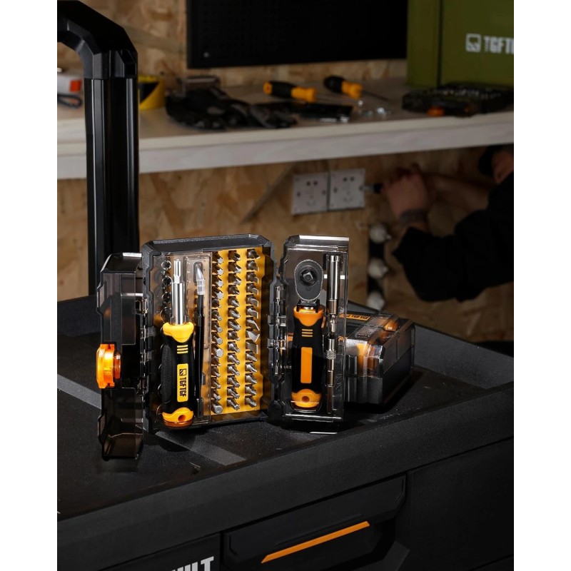 - [Double-Layer Transparent Cover Storage Case& Compact Organized] The well-designed storage case features two neatly arranged layers. The ratchet wrench and screwdriver handle are on the upper layer, and the sockets and bits are on the lower layer. The transparent cover allows for quick identification. The ratchet screwdriver set is placed in categories and has corresponding positions to be stuck, making the case more organized. No need to worry about not finding what you need.