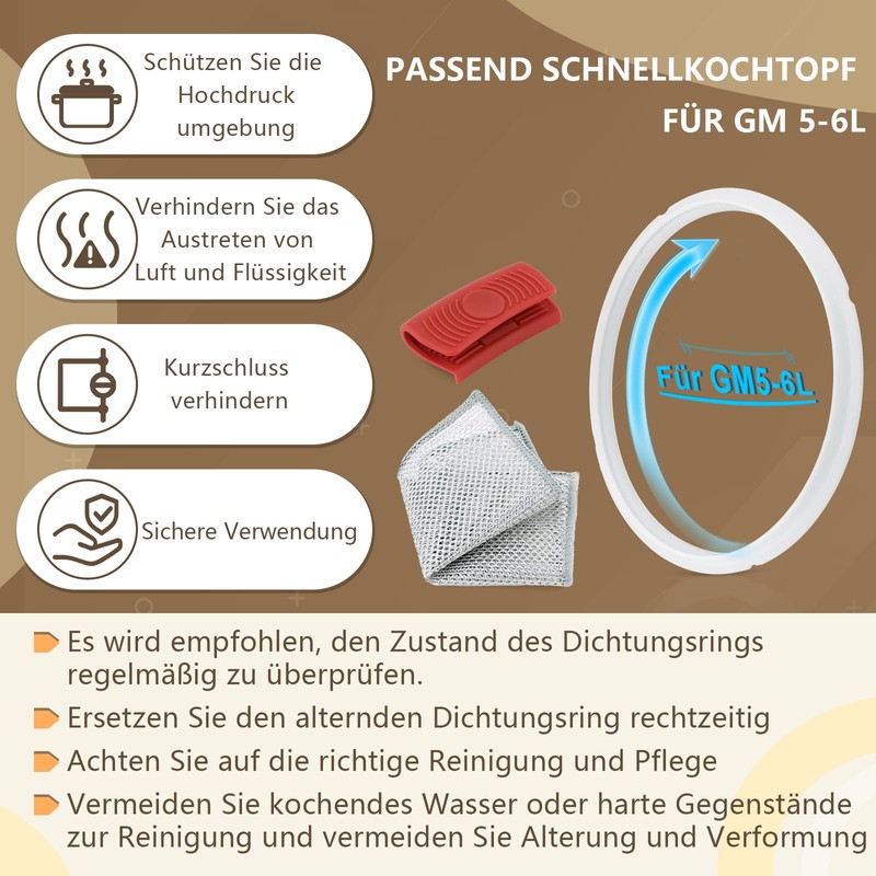 - High Quality Materials The pressure cooker sealing ring for GM 6L is made of high quality silicone, which is not easy to deform and wear, has good sealing and high elasticity. It keeps the steam pressure tight, shortens cooking time and helps you avoid problems such as overflowing soup, non-mushy braised meat and long cooking times caused by aging and deformation of the old sealing ring.
