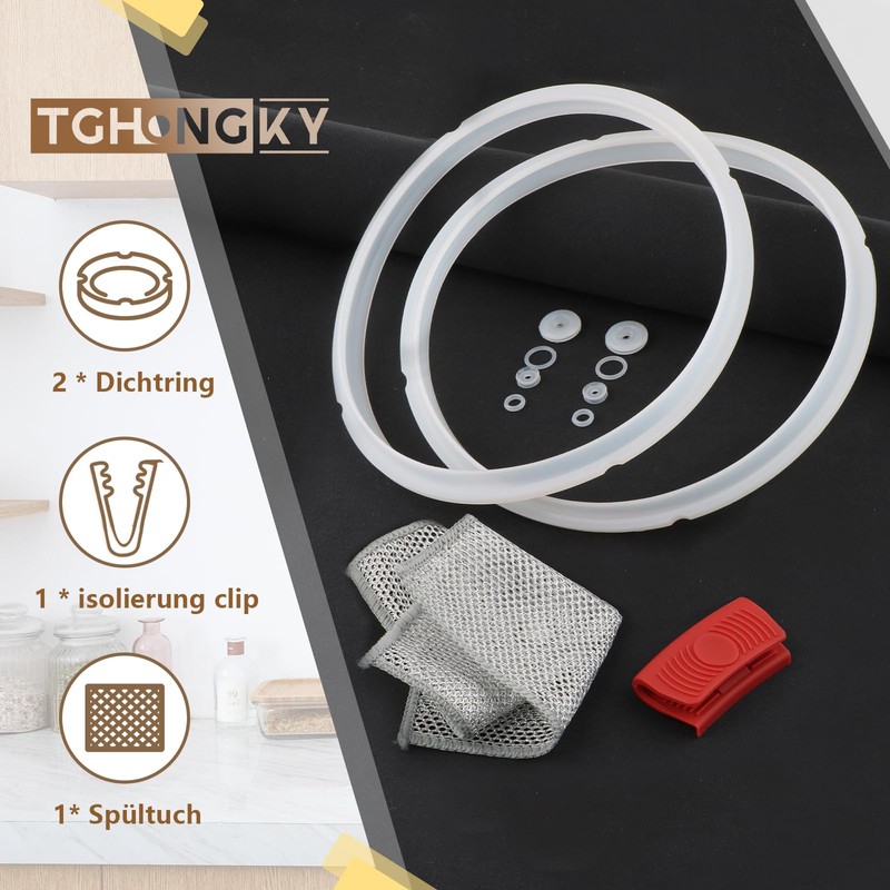 - Matching: match with heat insulation clip and steel wire dishcloth. The combination of sealing lid and sealing ring ensures better pressure in the pressure cooker and a better cooking result. The thermal insulation clip increases cooking safety. The steel wire tea towel makes cleaning the pot lid easier. Regular cleaning, checking and replacement will help extend the life of the device.