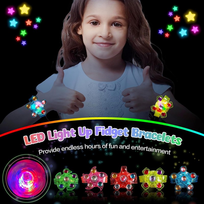 - ❤️【High Quality Bracelet】The wrist strap of this light up bracelet is smooth, soft, and skin-friendly, nice looking and comfortable! Adjustable lengths make it fit to most kids wrists. 3 small batteries inside make the light up toys last longer. High-quality bearings ensure you can still keep it as a fidget toys!