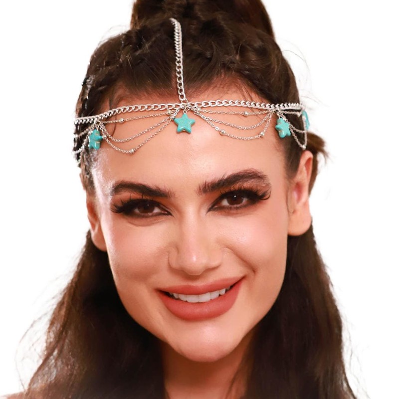 Tgirls Boho Turquoise Head Chain Jewelry Layered Beaded Headpiece Star Pendant Forehead for Women (Silver)
