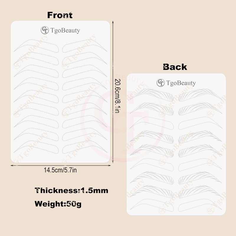 - Double Sided Designs: 9 pairs empty eyebrow shapes with thin tracer dots on the front, full hairstroke brow frames with 3 different common patterns on the back.