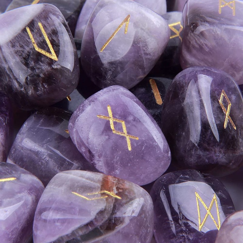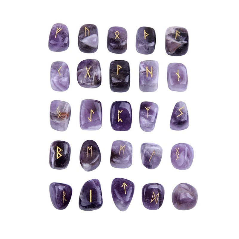 - Amethyst Rune Set of 25 stones, including 24 stones with engraving and one blank stone.