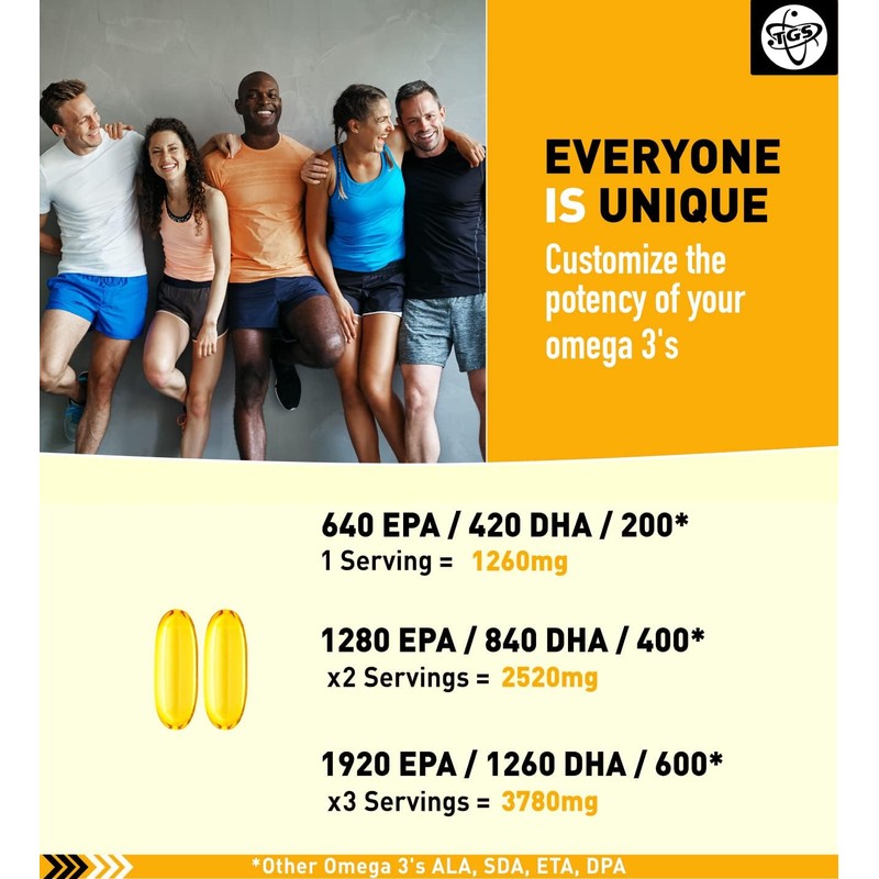 - TRIPLE STRENGTH, ULTIMATE EPA & DHA BALANCE: Our omega 3 supplement has 1260 mg of omega 3’s per serving with 640 mg EPA, 420 mg DHA & 200 mg of other essential omega 3’s; No omega 6 fillers. Need extra strength, 2000mg plus? Double the dose and take 2 servings for 2520 mg or triple dose with 3 servings for 3780 mg of pure omega 3’s; Customize your daily dose